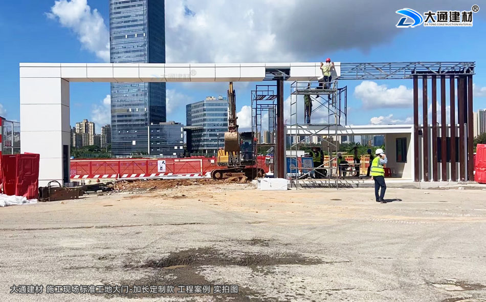 深圳市大通建材有限公司提供標準工地大門生產定制/配送安裝等服務,標準工地大門常規尺寸為14800mm*5600MM,一些項目工程有特殊需求的可以根據實際需求進行定制化生產,如下面展示的這款鋼結構標準工地大門定制加長款的尺寸是16800mm*5600MM,其它尺寸工地大門有需求的亦可定制化生產。
