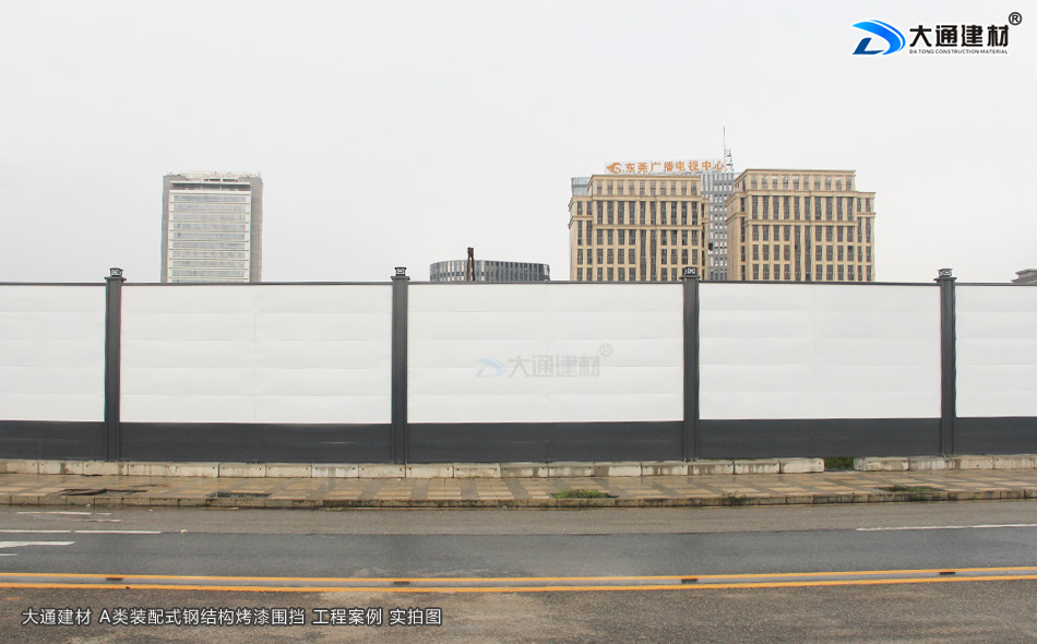 大通建材A類裝配式烤漆鋼結(jié)構(gòu)圍擋4米高定制款 適合對(duì)圍擋高度有特殊要求的工程項(xiàng)目使用,安裝地點(diǎn)位于廣東省東莞市南城區(qū)東莞廣播電視中心附近,圍擋安裝項(xiàng)目全長(zhǎng)680米。